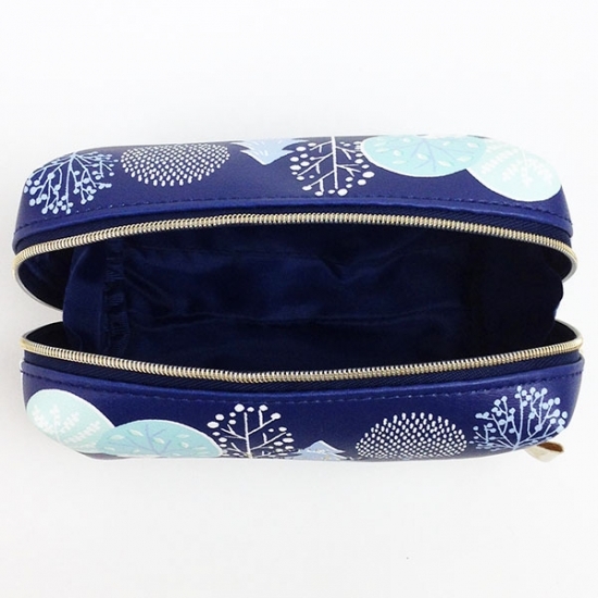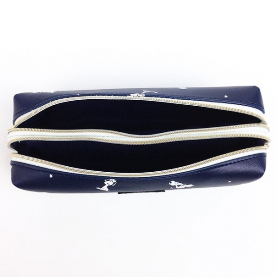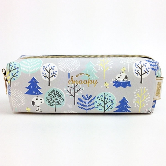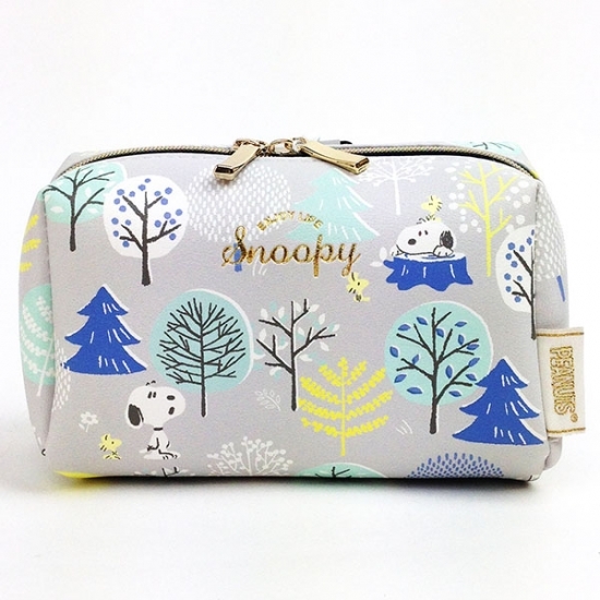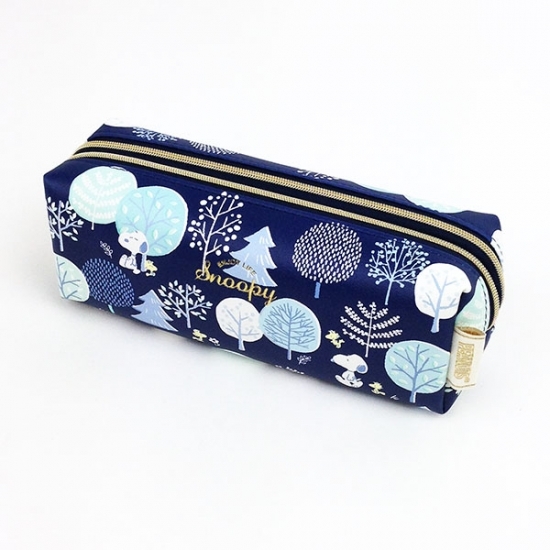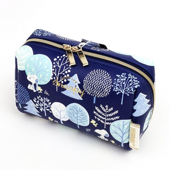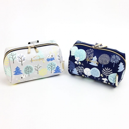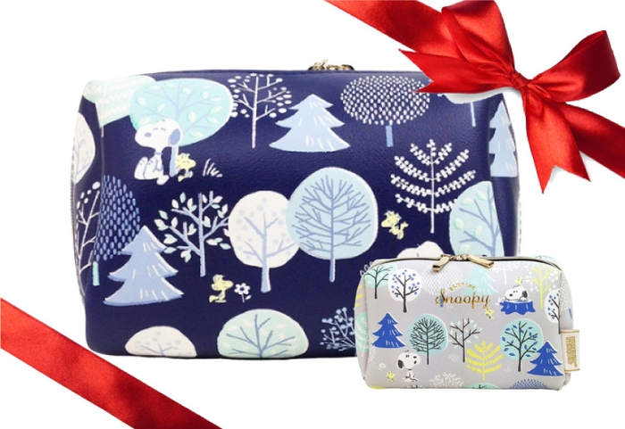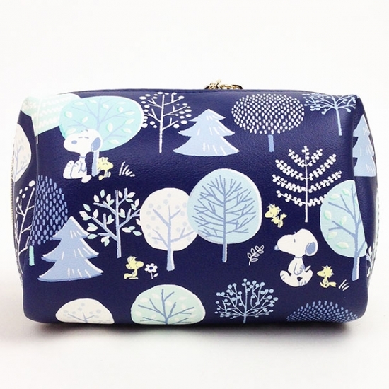 こちらがそのフォレストシリーズのポーチです。いかがですか?冬らしさ満載で、綺麗ですよね。ネイビー地に白とパステルブルーの木が描かれていて、その中をスヌーピーがお散歩中のようです。
