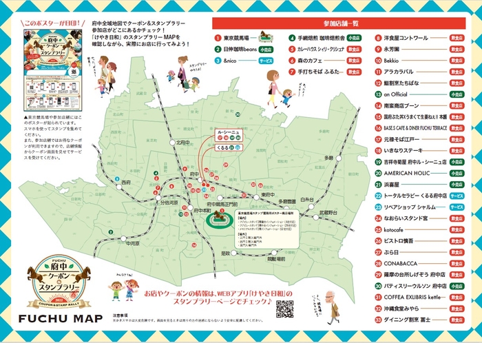 5月20日~7月6日までの期間、府中全域の33店舗/施設にスタンプラリーポイントが出現。