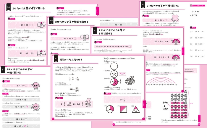 たし算、かけ算、分数の約分……いろいろな計算を楽しく解けて、計算力があがる内容に仕上がりました。