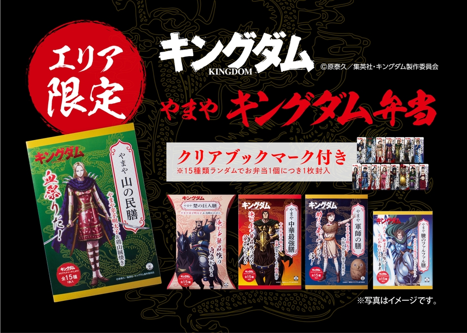 現在、放送中のTVアニメ「キングダム」で活躍するキャラクター「楊端和」、「蒙武」、「騰」、「河了貂」、「汗明」の全5種類のお弁当となっており、パッケージには「やまや キングダム弁当シリーズ」のために描き起こしたイラストを使用。各お弁当は販売エリアが限定されております。