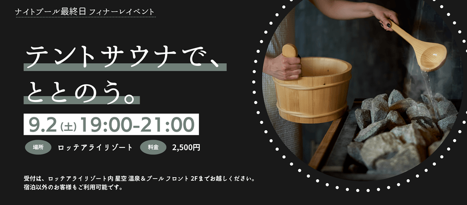 株式会社LOTTE Hotel Arai(ロッテアライリゾート/所在地:新潟県妙高市)では、9月2日のナイトプール最終日にフィナーレイベントとして一夜限りの「テントサウナイベント」を開催いたします。