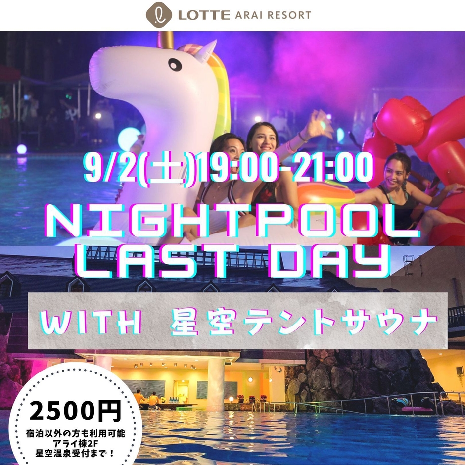 ロッテアライリゾートのナイトプールは夏限定の週末イベントです。今年はイベント開催日の9月2日がナイトプール最終日となっております。