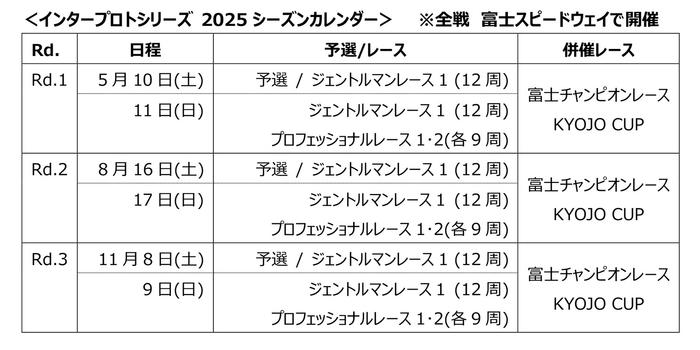 株式会社インタープロトモータースポーツ(代表:関谷正徳)は、2025年も国内トップドライバーが集結し運転技術を競い合う「インタープロトシリーズ(以下、IPS)」を富士スピードウェイで開催いたします。