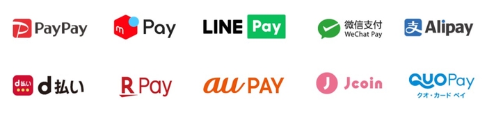 「PayPay」「メルペイ」「LINE Pay」「d払い」「楽天ペイ(アプリ決済)」「au PAY」「J-Coin Pay」「QUOカードPay」「WeChat Pay」「AliPay」