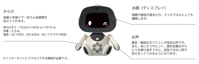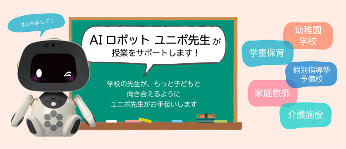 ユニボ先生は、ユニロボット株式会社(所在地:東京都渋谷区、代表取締役:酒井 拓)が開発したAIコミュニケーションロボットで、共同開発パートナーである株式会社エデュゲート(本店所在地:東京都中央区、代表:鈴木 博文)が教育現場向けにコンテンツを作成した、児童生徒の学習指導に特化したAIロボットです。