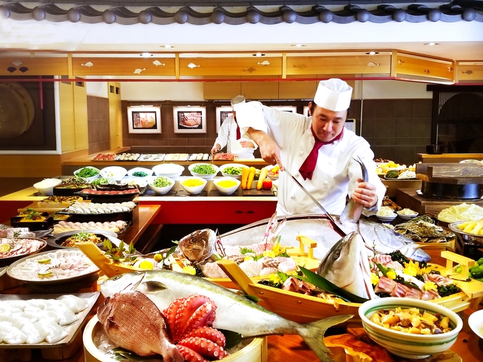 阿波の城下町をイメージしライブキッチンを設えたレストラン彩。阿波徳島と淡路、瀬戸内の地産地消の美味を、ランチ60種以上のメニューで食べ尽くします。鳴門鯛の旨みと風味を捌き方の違いで食べ比べる「板前の作り三刀流」、鳴門ワカメや鳴門金時、蓮根、阿波尾鶏、淡路島産玉葱などの揚げたて天婦羅、寿司、炭火焼、打ちたてうどん、鳴門金時スイーツなどが賑やかに並びます。