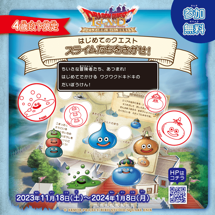 イベント期間中にアトラクションへ入場された4歳以下のお子様1名につき1枚、はじめてのクエスト「スライムたちをさがせ!」専用のスタンプシートをお渡しします。アトラクション内に設置された5カ所のスタンプ台を見つけ出し、全てのスタンプを集めましょう!