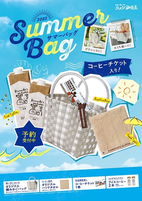 全国でフルサービス型の喫茶店を展開する株式会社コメダ[本社:愛知県 代表取締役社長:甘利祐一 グループ店舗数:995店舗(2023年5月末時点)]は、全国のコメダ珈琲店で2023年7月14日(金)から数量限定で「2023年サマーバッグ」を販売いたします。販売に先駆け、2023年6月5日(月)より各店舗で予約受付を開始いたします。なお、「2023年サマーバッグ」の販売ならびに予約受付は一部店舗を除きます。