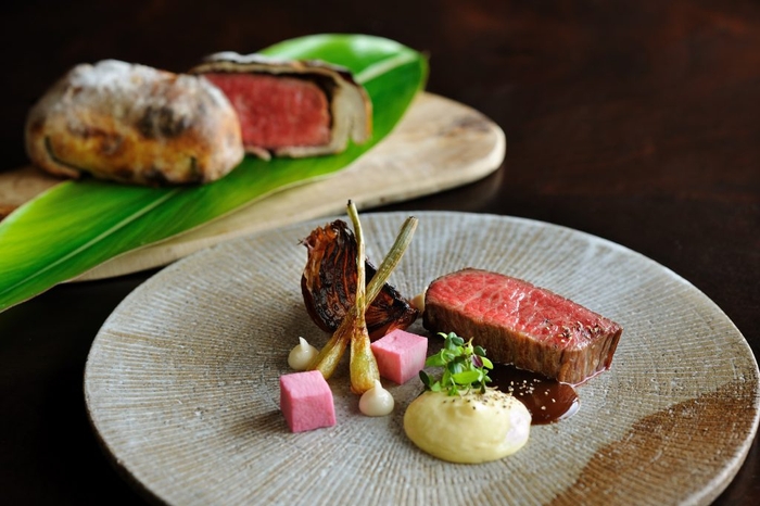 泡盛酒粕のクルート*2で和牛を包み焼きにしたメインディッシュ。間接的に焼き上げ、肉を柔らかく仕上げます。包み焼きにすることで泡盛酒粕の甘い香りを肉に纏(まと)わせ、優しい味わいに仕立てた一品です。ソースは上品な赤身肉の味わいに合う、バターと卵黄を使用したフレンチの伝統的なベアルネーズソースです。しっとりと焼き上げた和牛と、泡盛、パイン、島ラッキョウなど沖縄で親しまれる食材との相性を堪能できます。