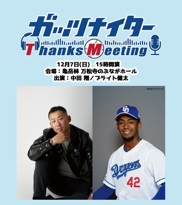 TOKAI RADIOは、プロ野球中継番組「ガッツナイター」ファンへの感謝を込めて、特別イベント「ガッツナイター Thanks Meeting」を実施する。12月7日(日)15時00分から、亀岳林 万松寺のぶながホール(愛知県名古屋市中区大須三丁目30-40 万松寺ビル8F)にて開催。出演は、中田翔(中日ドラゴンズOB)、ブライト健太(中日ドラゴンズ)。司会は、「ガッツナイター」で実況を務める森貴俊(TOKAI RADIO アナウンサー)。