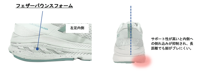 アーチフォーマー周囲に高反発素材のフェザーバウンスフォームを搭載。内側への倒れ込みをさらに抑制し、長距離走行をより快適にサポート。