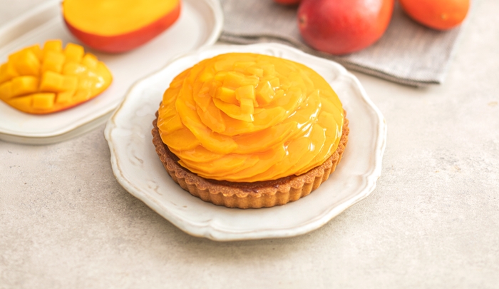 バター香るサクッと香ばしいアーモンドのタルトに宮崎県産マンゴー「熟赤の雫(あかのしずく)」を贅沢に約1玉分のせた季節限定のタルトです。