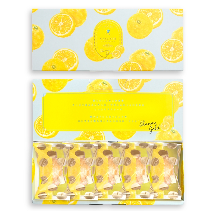 柑橘の爽やかな風味、季節限定の湘南ゴールド味のココン。神奈川県で生まれた柑橘、湘南ゴールドのピューレを使用し、オレンジシロップとともに柑橘の爽やかな風味が広がります。限定パッケージも夏らしく、贈り物にもおすすめです。