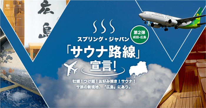 スプリング・ジャパン株式会社(本社:千葉県成田市、代表取締役社長:米澤 章、以下「スプリング・ジャパン」)、「JALサ旅」(*1)を展開する日本航空株式会社(本社:東京都品川区、代表取締役社長:赤坂 祐二、以下「JAL」)、「ご当地サウナ委員会」を運営する株式会社アドウェイズ・ベンチャーズ(本社:東京都新宿区、代表取締役社長:山田 翔、以下「アドウェイズ・ベンチャーズ」)の3社は、9月1日搭乗分よりスプリング・ジャパンの成田-広島線においてサウナ旅の特別プロモーションを展開します。