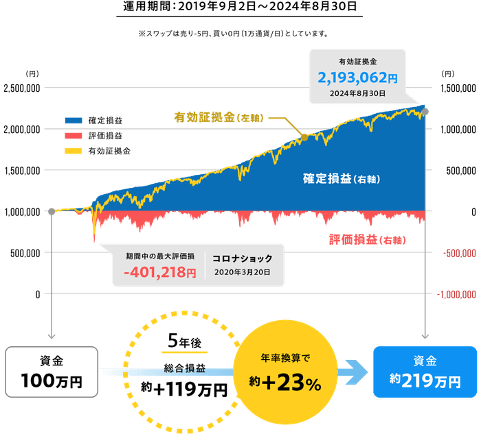 特設ページには、『トラリピ戦略リスト』で提案している「NOK/SEK Half&Half戦略」を2019年9月~2024年8月の5年間で運用した場合のバックテスト結果を掲載しております。