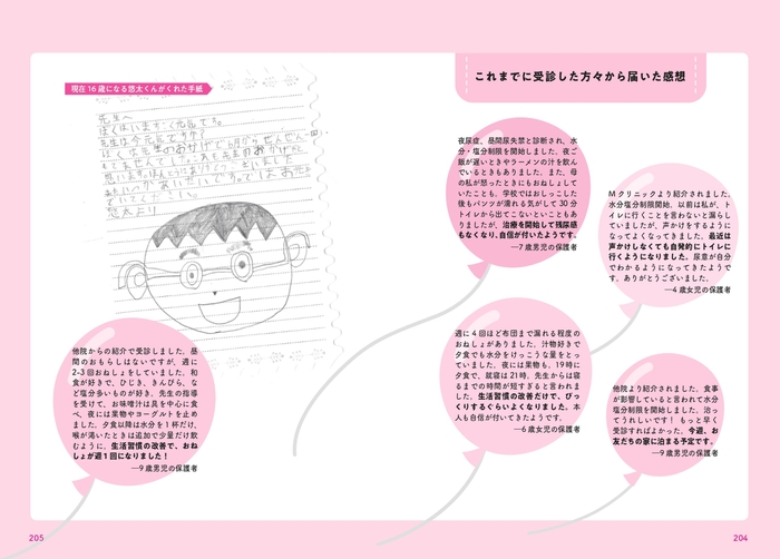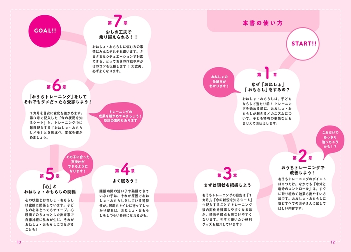 まず本書では“「おねしょ」と「おもらし」の違い”や、“おねしょ・おもらしの3大原因”、“トイレでおしっこをするための身体の仕組み”など基本的な事項からわかりやすく解説。