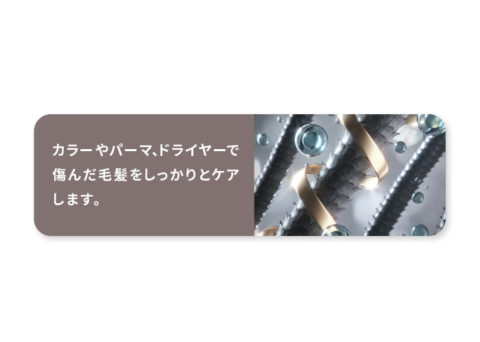 ダメージに反応しその部分を補修する成分(キトサンヒドロキシプロピルトリモニウムクロリド)を配合。傷んだ毛先を補修し、髪にハリ・コシを与えます。
