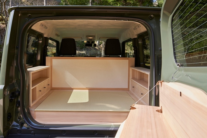 前席との境には、雪見障子の構造から着想を得た上下に可動する「障子」。天井には柔らかな風合いが美しい金糸が織り込まれた「西陣織」。両側の棚は「指物」の技術を用い、京都北西部・京北の杉ですっきりと仕上げました。床にはい草のにおいが車内に充満しないようにと配慮した、和紙製の「畳」。リアドアの内側には、「指物」の技術で床の間のような棚を設け、「漆」を施した「錺金具」が特別な棚であることを暗示。花器などを飾る場所として、茶室の趣を残しました。そして前席、シフトレバーに銀の「高蒔絵」を施し、亭主である運転手が経年の変化をそっと楽しめる遊び心も忘れません。お茶室のごとく、ジムニーに職人の技を集結しました。