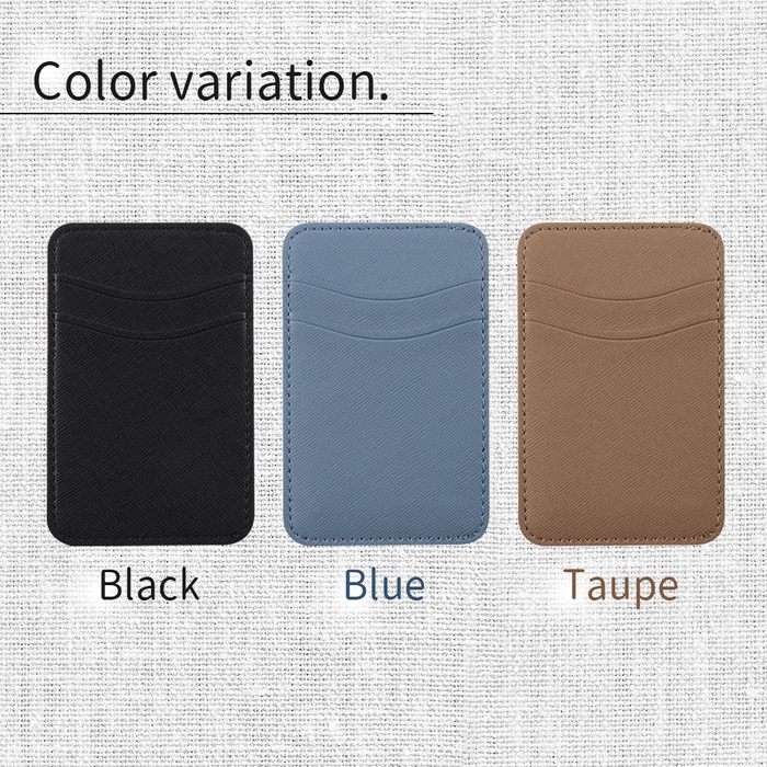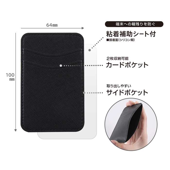 カードポケット本体:合成皮革(ポリウレタン素材)、シリコン糊(接着面) 粘着補助シート:PET、シリコン糊(接着面)