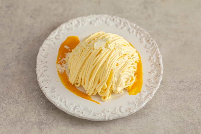 なめらかなマンゴーとチーズを合わせたクリームをオーダー毎に目の前でしぼるモンブラン。