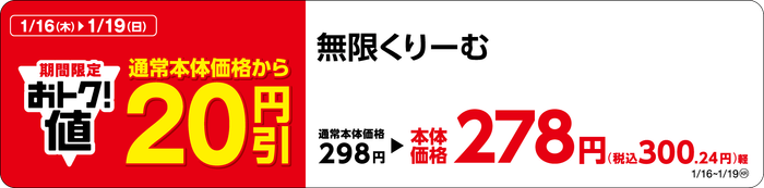 人気商品を、週末おトクに! 「無限くりーむ」20円引 期間:1月16日(木)~1月19日(日)
