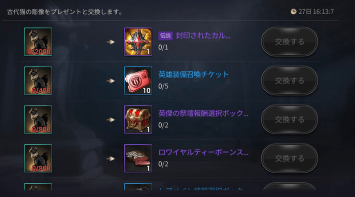 イベント期間中に冒険、討伐、伝承の大地で「古代猫の彫像」が獲得でき、イベントページ内の「ファントムの予告状を交換」で様々なアイテムと交換できます。