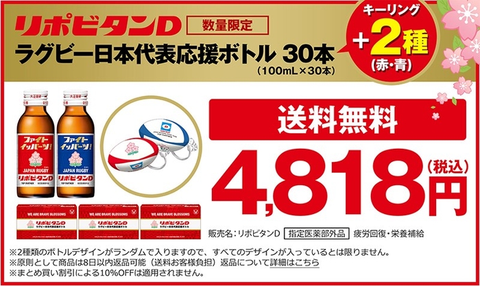 また、「リポビタンD ラグビー日本代表応援ボトル」を販売する当社オンラインショップの大正製薬ダイレクトでは、「リポビタンD ラグビー日本代表応援ボトル」を30本セットでご購入の方にオリジナルキーリング2種(赤・青)をプレゼントいたします(キーリングは数に限りがございます)。
