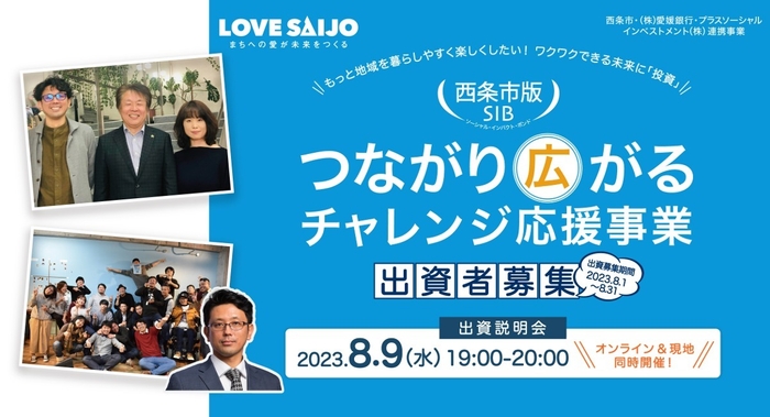 プラスソーシャルインベストメント株式会社(代表取締役社長 野池雅人、京都市上京区)は、「西条市SIB 起業&移住ぐんぐん加速化プロジェクト」を組成し、8月1日に取扱者として総額50万円(1口金額1万円)の募集を開始しました。