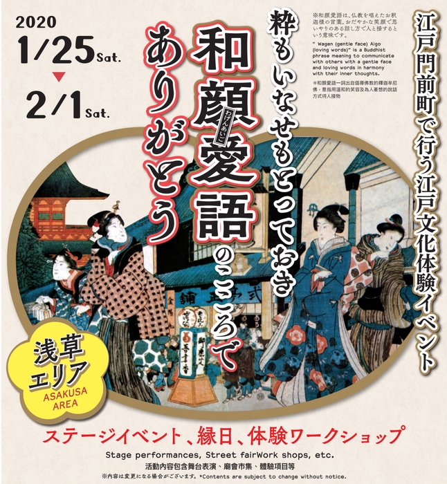 和顔愛語とは、おだやかな笑顔と思いやりのある話し方で人と接するという意味の仏教を唱えたお釈迦様の言葉です。本イベントは、その言葉が息づく浅草、築地の東京を代表する門前町で江戸文化を体験できる無料イベントです。