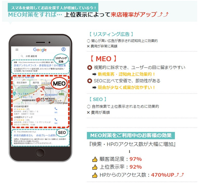MEOとは、Map Engine Optimization(マップ検索エンジン最適化)の略で、Google検索におけるマップ領域(=Googleマップ)で上位表示させるための施策のことです。