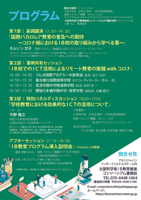 今回は、「国際バカロレア教育におけるICT活用について~アフターコロナに向けた挑戦~」をテーマに、国際バカロレア機構による講演や国際バカロレア認定校でのリモート教育の実践事例の共有、パネルディスカッションも予定しております。また、国際バカロレア導入について相談をご希望の方向けに、導入説明会も併せて実施します。国際バカロレア教育に関心のある教育関係者や自治体等をはじめ、学生や保護者など、どなたでもご参加頂けます。