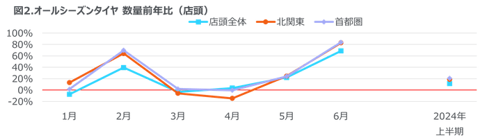 オールシーズンタイヤの2024年上半期の数量前年比は全体で34%減と大幅な減少となったが、店頭販売では同11%増と二桁成長を見せた(図2)。特に北関東と首都圏で販売が伸びており、数量前年比はそれぞれ19%増、21%増に至った。これは2月の降雪による影響が大きく、北関東、首都圏では前年同月の1.6倍を超える規模となった。