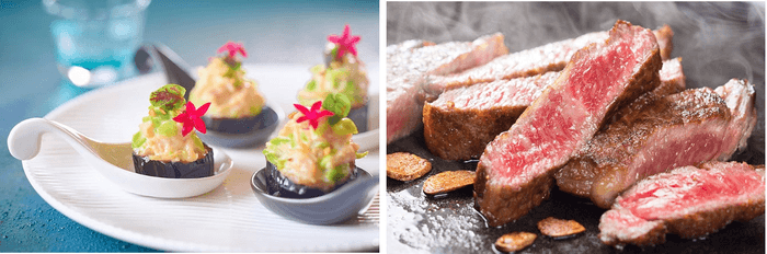 右:定番の美味しさ、サーロインステーキはライブキッチンから焼きたてをご提供いたします。
