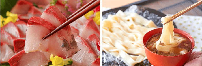 右:茹で上げた後、冷たい水でしめた喉越しの良い麺を具沢山の温かいつゆにつけて食べる「おざら」。盆地のため猛暑となる山梨の夏に欠かせない、ほうとうと並ぶ郷土料理です。