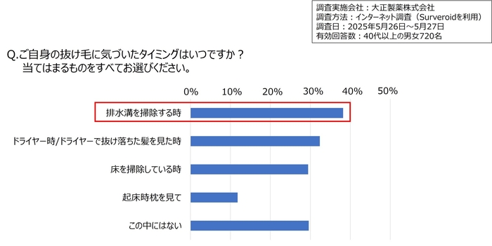 さらに、2025年5月に40代以上の男女720名を対象に「抜け毛に気づくタイミング」に関するアンケートも実施しました。その結果、抜け毛に気づくタイミングとして最も多いのは、排水口を掃除する時であることがわかりました。