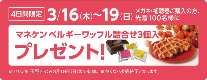 オープンを記念し3/16(木)~19(日)の4日間、メガネ・補聴器をお買い上げの方 先着100名様に、「マネケン」のベルギーワッフル詰め合わせ3個入りをプレゼント! ※無くなり次第終了となります。