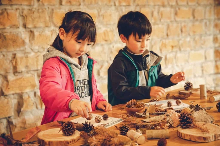 木の葉、小石、木の実など森で見つけたものを使い、ホテル内のスペースで手軽にクラフト体験ができます。ギザギザした葉、丸みを帯びた小石、色づく木の実など、どのような素材を使うかは子どもたちの自由です。一つ一つ形が異なる自然の素材を使い、作品を仕上げることで、楽しみながら創造力を育むことに繋がります。