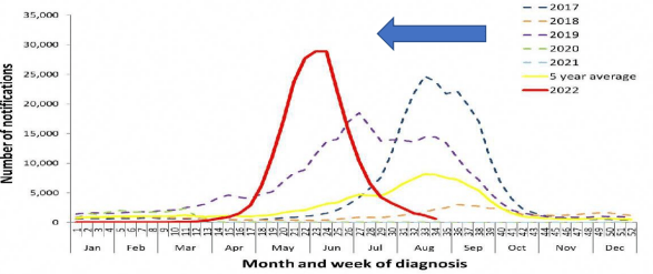 南半球のオーストラリアでは、日本より早くインフルエンザのピークが到来します。下記のグラフを見てみると2022年の5月~7月にかけての感染者がコロナ禍以前の人数より多くなっています。このため、例年秋から春にかけてピークを迎える日本でも感染者数が多くなると予想されています。