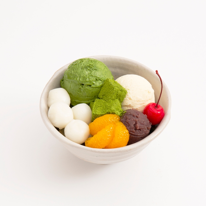 自家製の寒天に抹茶ゼリーや白玉だんご・小豆・抹茶のわらび餅をのせ、バニラアイスと抹茶アイスをのせました。