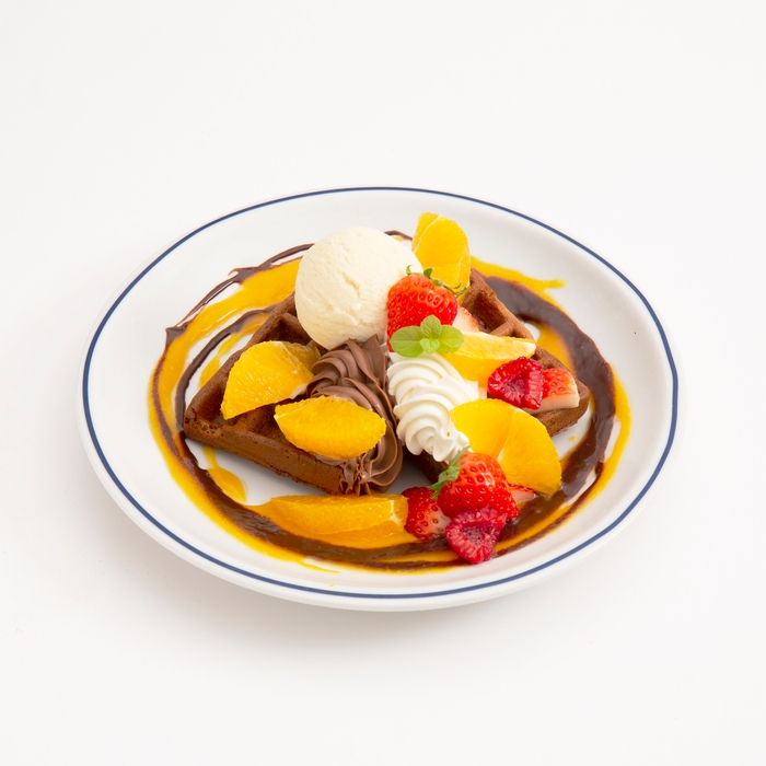 アーモンドを練り込んだ風味の良いココアワッフルに生チョコクリームをしぼり、オレンジやベリーを盛り付けました。