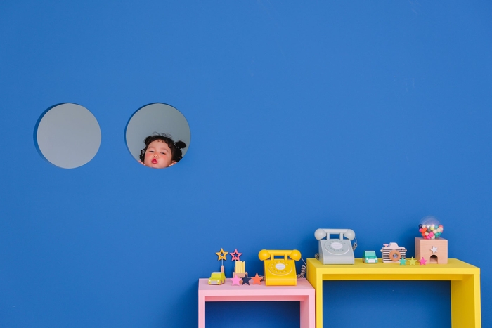 撮影スペースのデザインは、ハピスタの定番は残しつつ、kiko+ & ggらしいアイデアがつまったこれまでにない仕上がりに。カラフルに彩られたスペースの中には、船をモチーフにしたひみつの小窓のほか、とびらが隠れていたり、のぼって遊べる階段があったり、楽しいしかけがたくさん。着物にぴったりの和室もあり、ここにもポップなカラーを取り入れました。入った瞬間から撮影中までずっと、ワクワクがいっぱいの空間です。