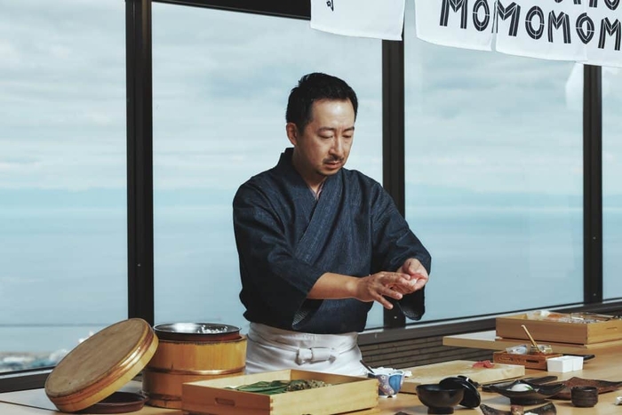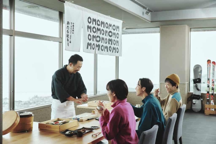 OMO5小樽から車で約10分のところに位置する小樽天狗山スキー場は、海の絶景を眺めながらスキーができる、港町ならではのスキー場です。このスキー場の山頂にあるカフェ「TENGUU CAFE」でOMO5小樽の宿泊者限定でお寿司を提供します。ゲレンデの雪景色と小樽湾の絶景を眺められる場所に寿司カウンターを設置。絶景を眺めながら、お寿司を堪能することができます。