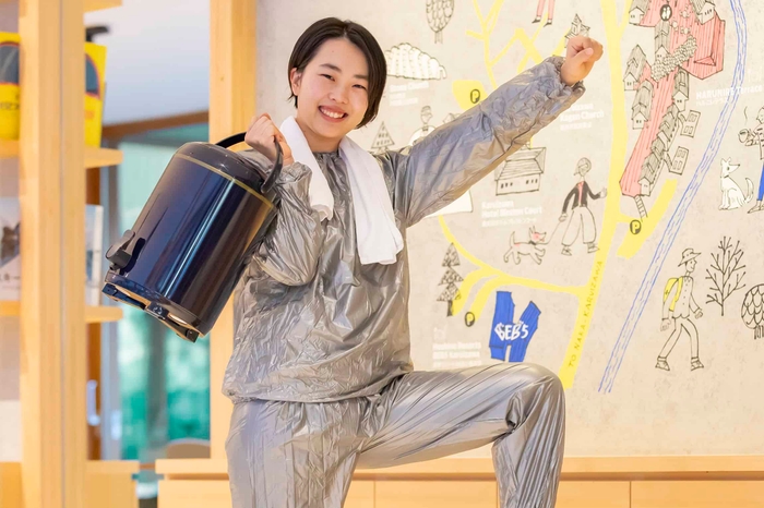 当ホテルが位置する軽井沢星野エリアには、大きな広場や勾配約15~20%の坂があります。大きな広場で長距離を走るもよし、坂で猛ダッシュするのもよし、好みの場所で走って汗をかくことができます。より一層汗をかくことができるようサウナスーツの無料貸し出しや、水分補給のための「軽井沢野鳥の森」を水源とした飲料水10リットルをホテル到着時にお渡しします。