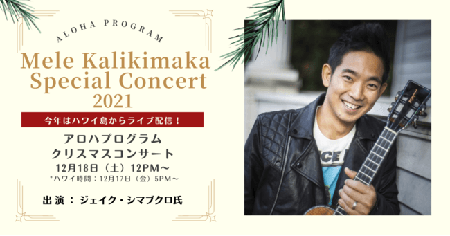 このクリスマスコンサートでは、シマブクロ氏の代表曲に加えて、クラシックやオリジナル楽曲からホリデーシーズンに相応しい曲を、今年はハワイ島のカヒルシアターからオンラインでライブをお届けします。聴き手と深い感情的な繋がりを共有するシマブクロ氏のコンサートは、気分が明るくなるような楽しいクリスマスの雰囲気をお楽しみいただけます。また、視聴者には抽選でジェイク・シマブクロ氏サイン入り「シマウクレレ」など素敵なクリスマスプレゼントを用意しています。