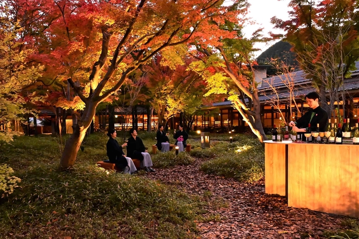 紅葉が色づき始めから終わりまでの期間限定で、界 鬼怒川の中庭に「湯上がり紅葉ワインバー」が登場し、紅葉を愛でながらワインを楽しむことができます。ワインとともに美しい秋景色を堪能していただく為に、紅葉がよく見える場所にはお席を用意します。自然豊かな中庭で秋の情緒を感じながら、大切な人と心地よい湯上がり時間を楽しめます。