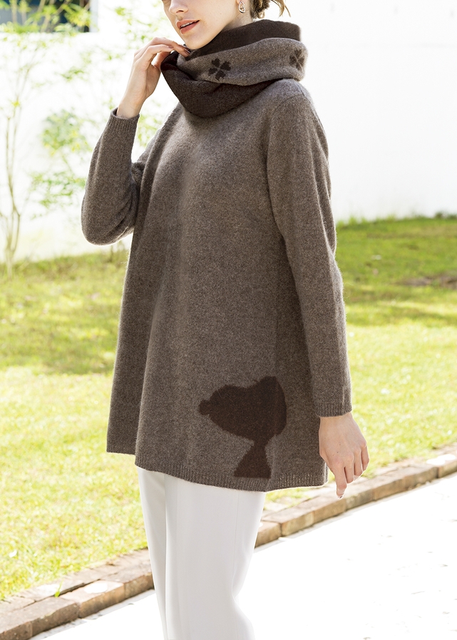 カシミヤを超える希少性と温かさを誇る高級天然素材「ヤク」を惜しみなく用い、スヌーピーの愛らしいシルエットを編み込んだ、心なごむニットチュニックとスヌードのセットです。