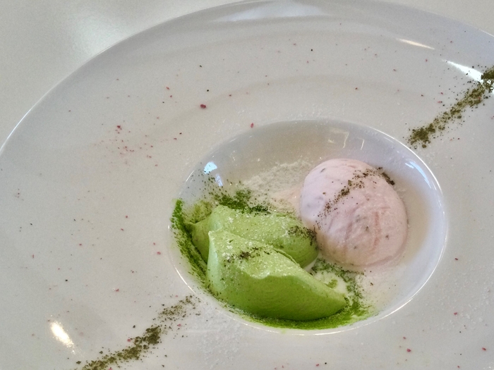 「抹茶のパンナコッタ 桜のジェラート添え」
