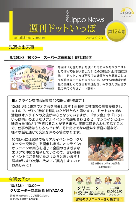 それぞれ忙しく働くフリーランスが集まるコミュニティですので、イベントに参加できなかった人でもイベント等の状況が分かるように、『週刊ドットいっぽ』というコミュニティ内の配信を毎週行っています。