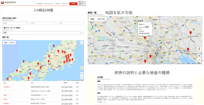 大分類→中分類→小分類と選択し、その病気の症例データ実績のある病院が地図とリストへプロットされます。