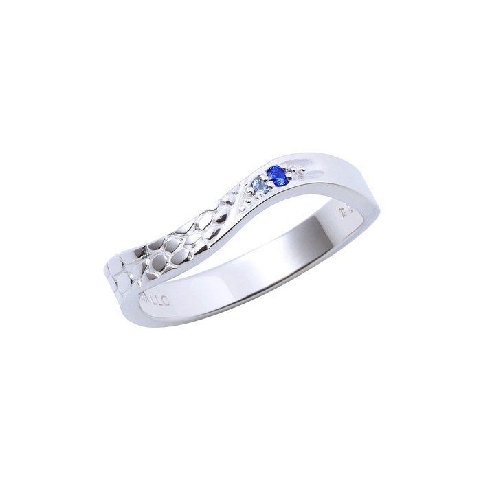 羽織の蛇柄をリング表面に取り込んだウェーブタイプのデザインに、イメージカラーストーンをセット。内側には名前を刻印しました。